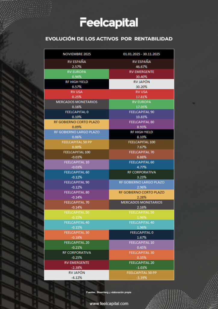 Desde Feelcapital os presentamos la tabla de evolución de los activos por rentabilidad y de nuestras carteras de referencia a cierre del mes de noviembre de 2025 y de todo el año 2025 hasta el 30 de noviembre de 2025.